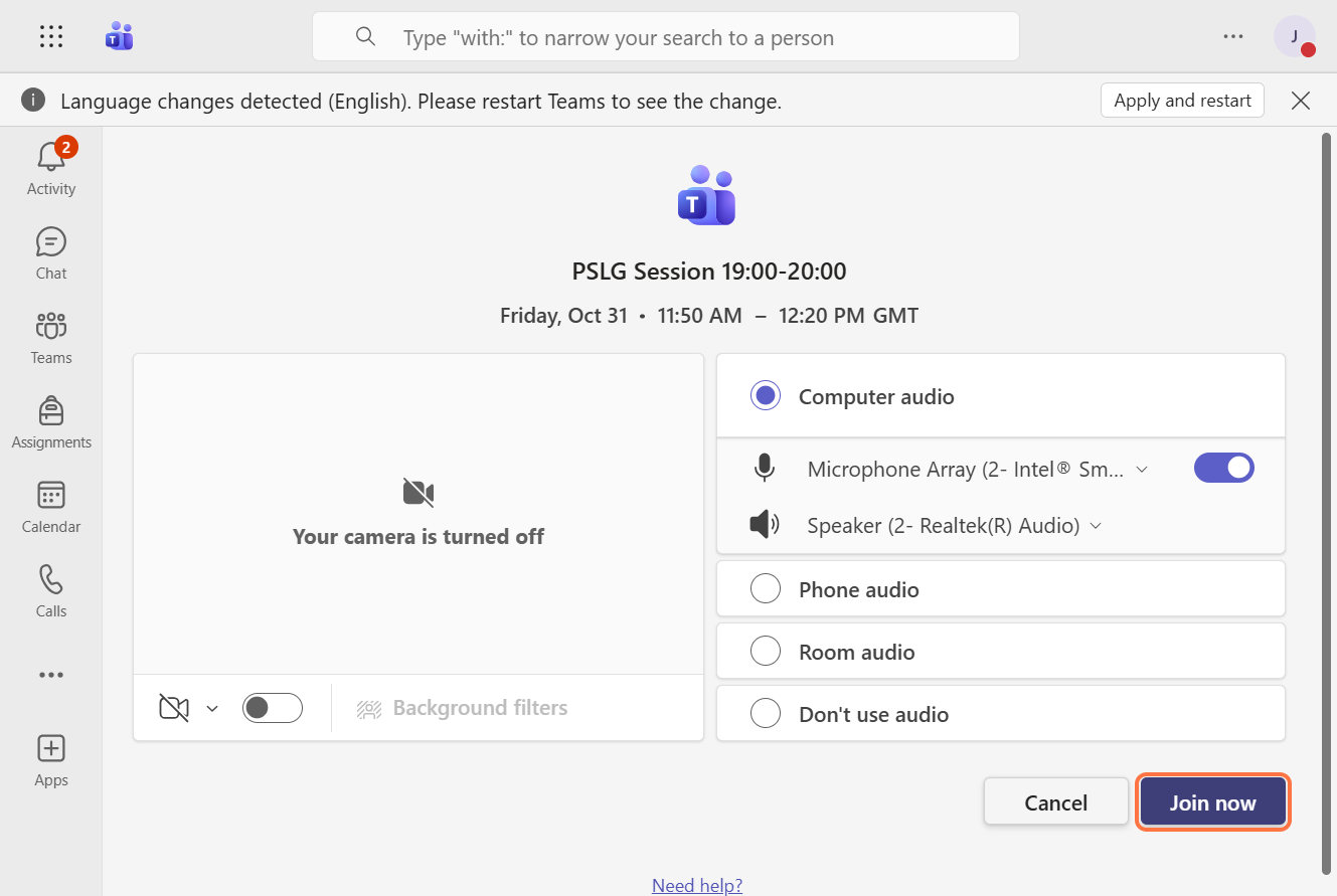 Select the mic icon at the top of the screen to turn your mic on/off freely throughout the session.