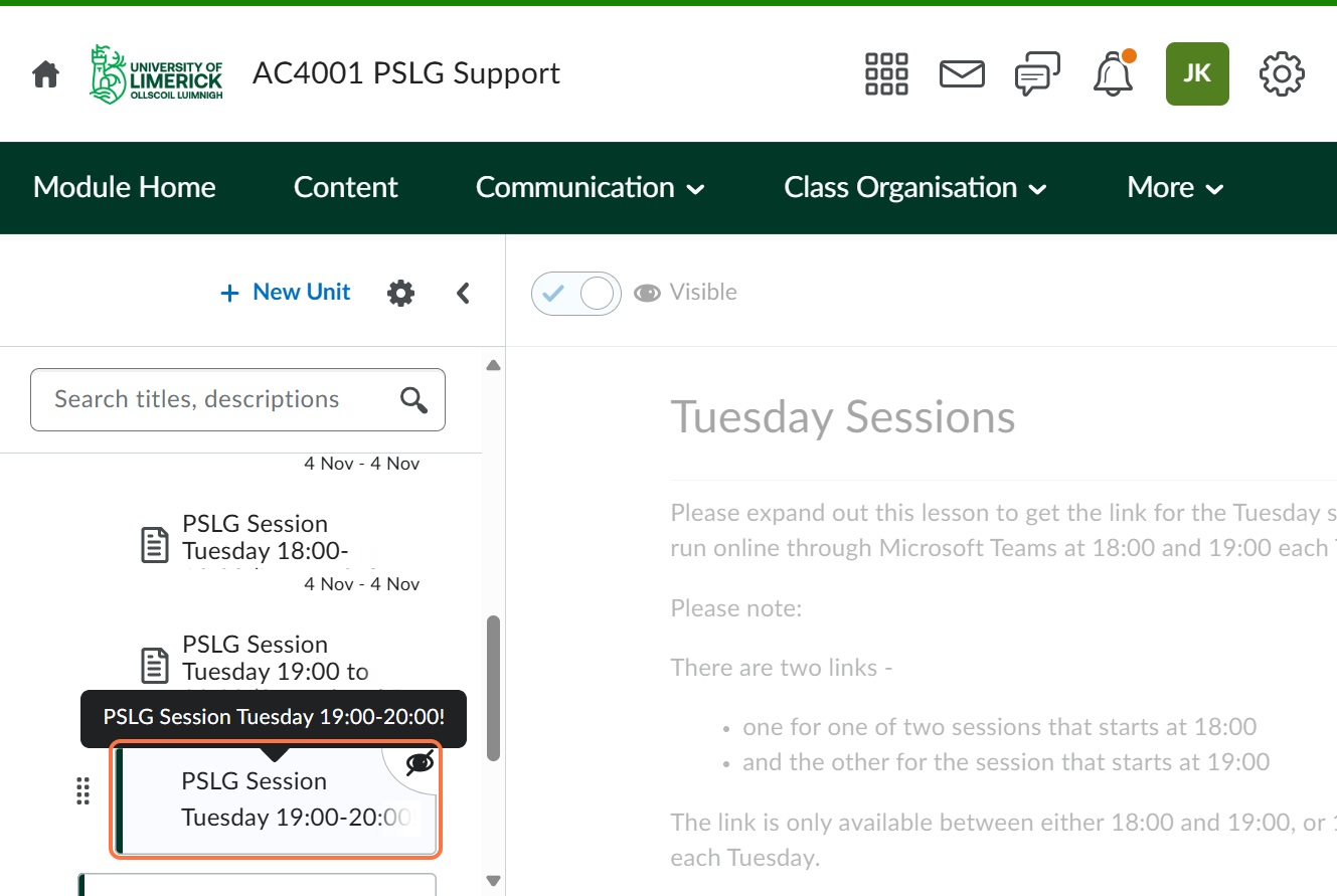 How to use the AC4001 PSLG Support BrightSpace site to attend a PSLG support session.
